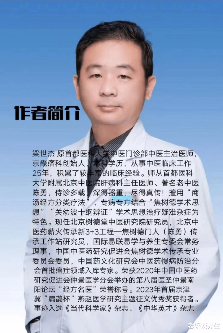 作者简介:梁世杰原首都医科大学中医门诊部中医主治医师,京畿瘤科创始人,本科学历,从事中医临床工作25年,积累了较丰富的临床经验。师从首都医科大学附属北京中医院肝病科主任医师、著名老中医陈勇,侍诊多载,深得器重,尽得真传!擅用“商汤经方分类疗法”、专病专方结合“焦树德学术思想”“关幼波十纲辨证”学术思想治疗疑难杂症为特色。现任北京树德堂中医研究院研究员,北京中医药薪火传承新3+3工程—焦树德门人(陈勇)传承工作站研究员,国际易联易学与养生专委会常务理事,中国中医药研究促进会焦树德学术传承专业委员会委员,中国药文化研究会中医药慢病防治分会首批癌症领域入库专家。荣获2020年中国中医药研究促进会仲景医学分会举办的第八届医圣仲景南阳论坛“经方名医”荣誉称号。2023年首届京津冀“扁鹊杯”燕赵医学研究主题征文优秀奖获得者。事迹入选《当代科学家》杂志、《中华英才》杂志。